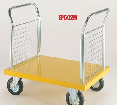 Coloured platform trucks. High quality powder coated decks in a range of attractive colours, with bright zinc plated fixed mesh ends and removable sides. end panels fixed, side panels removable.