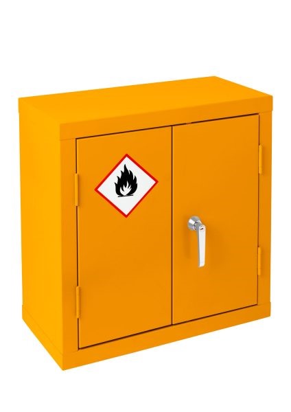 Welded construction in 0.9mm thick steel,supplied with adjustable spillage trays and liquid tight sump tray. Doors are rebated and secured by chrome locking handle. High visibility powder coated finish with appropriate warning labels. Shelves have 75kg UDL